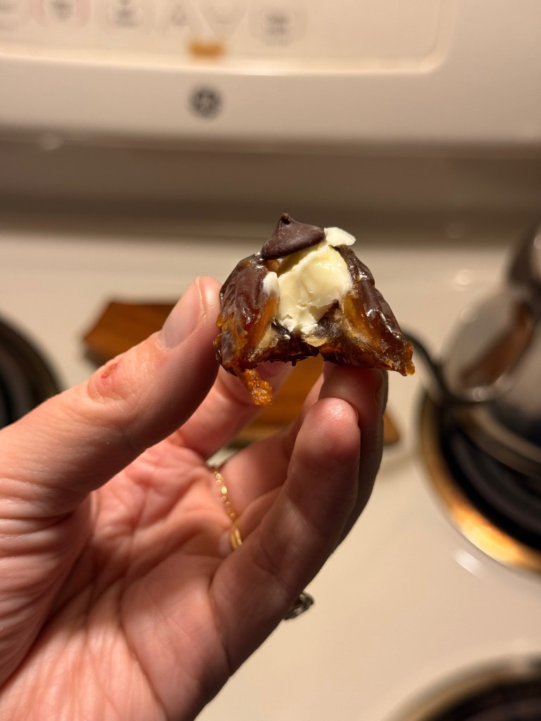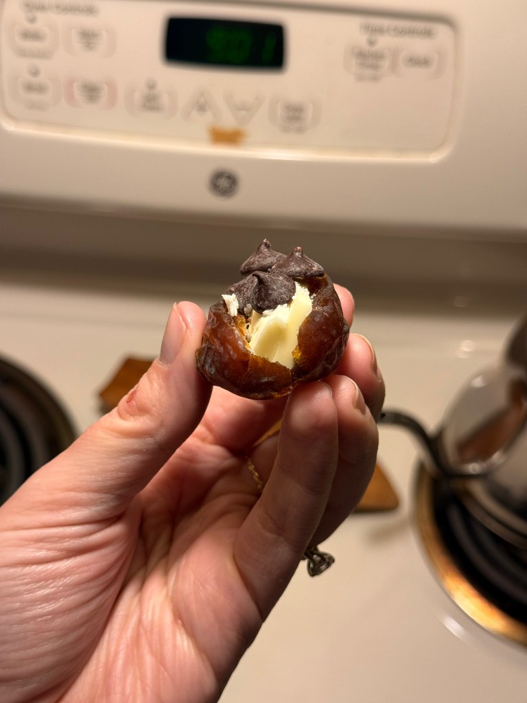 Cut the dates open (for this recipe, I only do 2 of these because they’re so filling for some reason!). Now is when you will remove the pit, if you bought whole dates. You won’t be flattening these dates, like we did in the prior recipe. Now, cut a small sliver of butter and place it inside the date. Press a couple chocolate chips into the butter and enjoy! These are so easy to make and so insanely delicious. I was weirded out when I first saw someone mention the recipe, but then I tried it and I can’t get enough.